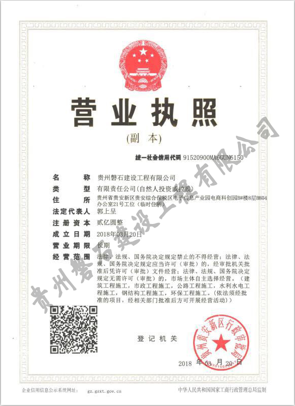 貴州磐石建設(shè)工程有限公司是貴州省磐石實業(yè)集團控股的一家建設(shè)單位,主要從事公路、鐵路隧道、水電站橋涵、井巷、路基、土石方等多種施工公司。公司注冊資金2000萬,資金雄厚,公司同時擁有一支高技術(shù)人才隊伍,工程設(shè)備數(shù)百臺。